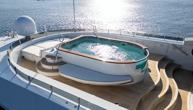 The onboard offering is strong: a beach club, tender garage, swimming pool, movie theatre, outdoor bar, exterior bar, sun deck, foredeck seating, gym equipment, BBQ, outdoor shower, and at-anchor stabilisers. Water toys include an e-foil fliteboard, seabobs, kayaks, paddleboards, wake boards, water skis for adults and children, fishing equipment, scuba diving equipment, snorkelling gear, and towable inflatables. The combination of facilities and range makes ALFA G a versatile option across a long Mediterranean season.
