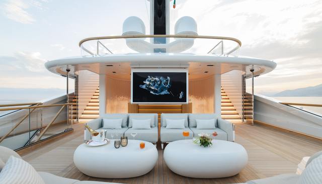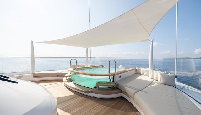 The water sports inventory includes foilboards, waverunners, Seabobs, kayaks, paddleboards, a waterslide, inflatable trampoline, floating pool, towable toys, and snorkelling gear. Alvia operates as a charter yacht with the build quality and crew complement that most clients associate with private ownership, making her relevant to guests whose expectations have been shaped by sailing on owned rather than chartered vessels.
