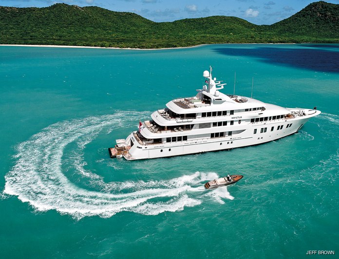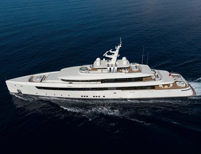 The onboard facilities are extensive: a beach club, spa, helipad, elevator, deck jacuzzi, swimming pool, outdoor shower, and exterior bar establish a comprehensive amenity set. Water sports options include a waterslide, waverunner, Seabob, flyboard, foilboard, paddleboards, inflatable water toys, a floating pool, and scuba and snorkelling equipment. The floating jet-ski dock adds an element of convenience rarely seen at anchor.