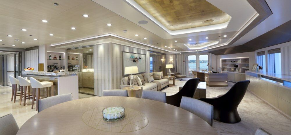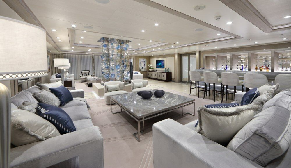 The onboard character is oriented around relaxed, unhurried living at sea. The presence of a beauty salon and full air conditioning across a vessel of this volume speaks to long-duration comfort, appropriate for extended itineraries where guests spend meaningful time aboard rather than treating the yacht as a floating hotel between port calls. The generous pool, rare at this proportion on a working displacement hull, anchors the outdoor experience.