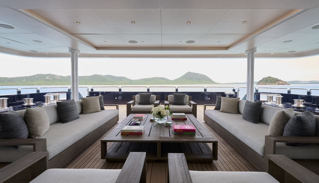 On board, the amenity and water sports inventory is among the most extensive recorded for this vessel class. In addition to a swimming pool, gym, massage room, and deck jacuzzi, the water toys include three Seabobs, four Jobe sea scooters, an efoil, two foilboards, an e-surf, two jet skis, kayaks, paddleboards, wakeboard, wakesurf, scuba diving equipment, floating golf, an inflatable water park, and a floating pool. For active guests, this level of charter yacht provision is rarely matched at comparable length. The beach club and tender garage provide the infrastructure to deploy and retrieve this equipment efficiently.