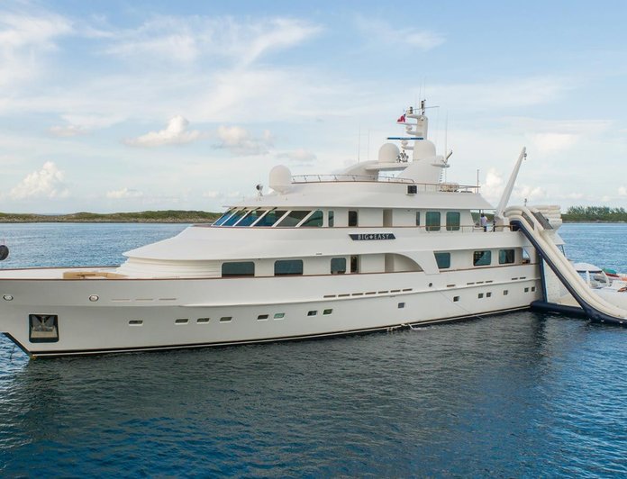 Onboard, BIG EASY offers both at-anchor and underway stabilizers, a deck jacuzzi, and a water sports programme featuring Seabob F5S units, jet skis, a floating pool, an inflatable climbing wall, and a waterslide — a range that suits active families with children as well as adults. Fishing equipment and snorkelling gear round out the leisure offering. The tone is confident and well-maintained rather than showy.