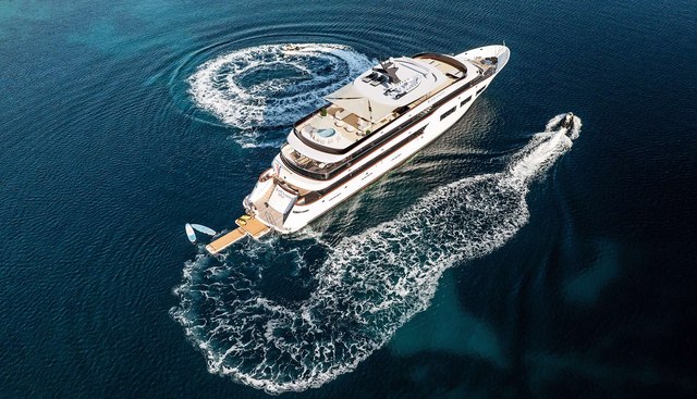 The onboard programme is comprehensive for a vessel of her size. A children's playroom, piano, movie theatre, massage room, and sauna indicate a vessel designed for extended occupancy. Water sports include Seabobs, jet skis, a flyboard, a waterslide, paddleboards, bikes, wakeboards, water skis, and towable toys. The deck jacuzzi, BBQ, and exterior bar support social gathering at anchor.