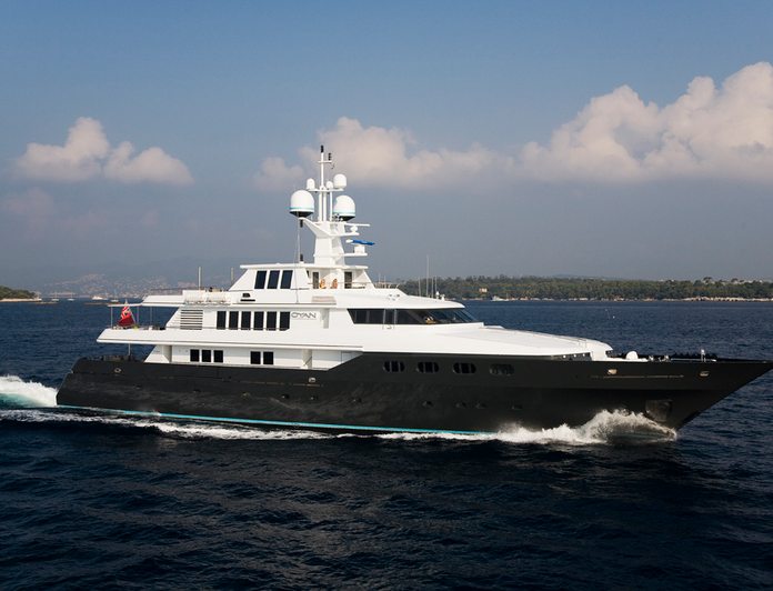 CYAN is a 48.7-metre steel displacement motor yacht built by Codecasa in 1997, refitted in 2016, and registered under the United Kingdom flag. Her interiors were designed by Della Role Design and Nina Seirafi, and at 584 gross tons she accommodates 12 guests in six cabins served by a crew of twelve. Twin MTU engines provide a 13-knot cruise and a top speed of 19 knots, with a range of 6,391 nautical miles — one of the longest in her class.