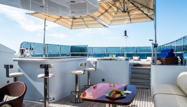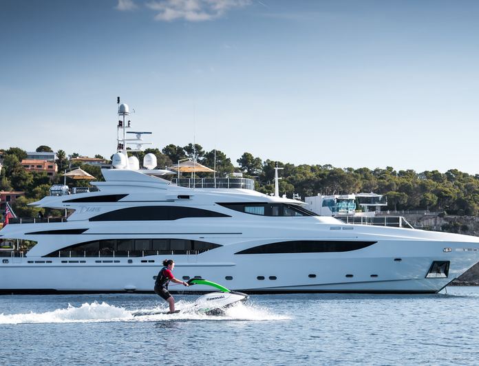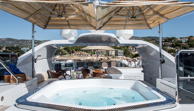 Onboard, DIANE is well equipped: deck jacuzzi, BBQ, gym, outdoor bar, sun deck with sunpads, swim platform, and both underway and at-anchor stabilisers. The toy inventory is extensive — three jet skis (two Kawasaki models including an 800cc and a 1200cc), two Seabob F5S units, two inflatable kayaks, two inflatable paddleboards, two wakeboards, a floating pool, water skis, towable toys, and snorkelling equipment. This is a comprehensive package suited to an active group in the Balearic summer season.