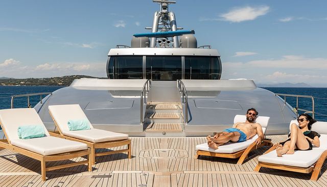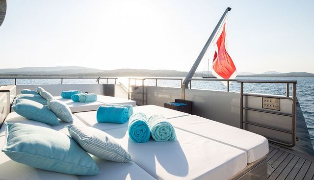 The amenities package includes a jacuzzi and deck jacuzzi, gym, at-anchor and underway stabilisers, and sunpads. The water sports inventory is notably comprehensive for the vessel type: dinghy sail boats, jet-skis, Seabobs, paddleboards, kayaks, windsurfers, electric scooters, e-foil, wakeboards, water-skis, and scuba diving equipment for four. This provision reflects the Eastern Mediterranean charter guest's expectation of active water programming in clear, sheltered anchorages.
