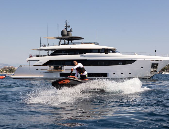 The deck layout is well-specified for the size: sun deck, sunpads, deck jacuzzi, exterior bar, and BBQ give guests multiple outdoor social spaces. A swimming platform provides water access, and the watersports inventory includes a jet ski, two Seabobs, paddleboard, wakeboard, towable inflatables, and snorkelling gear — a practical selection for a twelve-guest summer charter yacht.