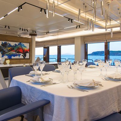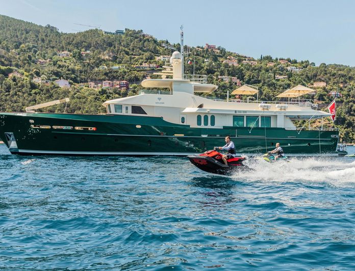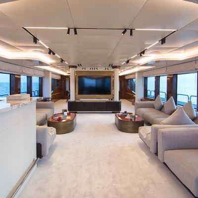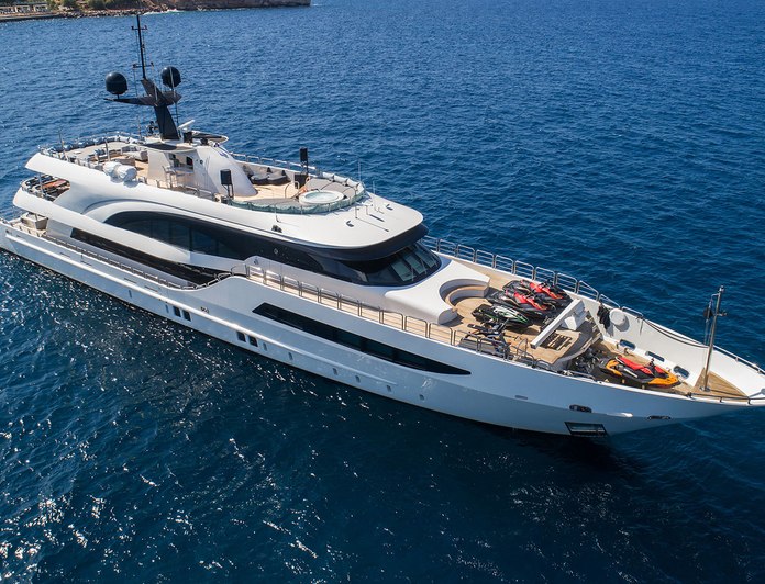 The watersports programme is extensive: four jet skis of different types (including Sea-Doo RXP-X 300s and a stand-up Kawasaki SX-R), two Seabobs, two paddleboards, a flyboard, wakeboard, kneeboard, U-tubes, towable toys, fishing gear, and snorkelling equipment. The swimming platform and deck jacuzzi anchor the at-anchor experience. A gym is available for guests who prioritise fitness. The overall character is active rather than sedate, which makes her well matched to charter groups who want to use a charter yacht rather than simply occupy one.