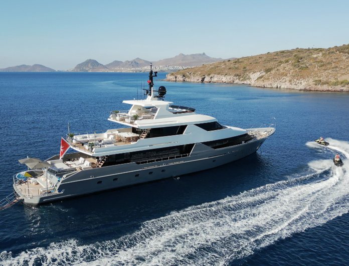 Scaro Design's exterior and the Oguz Develi interior represent a coherent approach to a vessel that has been updated rather than rebuilt. The 2023 refit ensures that the fabric of the yacht meets the expectations a contemporary charter yacht market brings, while the aluminium hull maintains the weight and sea-keeping characteristics appropriate to Aegean conditions. Underwater lights extend the ambience into evenings at anchor.