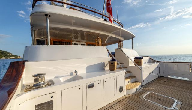Onboard, the deck jacuzzi, Jacuzzi, and Wi-Fi represent the primary amenity highlights. Her water toy selection includes two Yamaha Waverunners, two Seabobs, water-skis, wakeboard, doughnuts, paddleboards, a banana towable, fishing equipment, and snorkelling gear — a versatile complement for active days at anchor. The combination of Bannenberg-era design pedigree and a recent refit makes this yacht charter option well suited to guests who value character, provenance, and Mediterranean range over contemporary specification.
