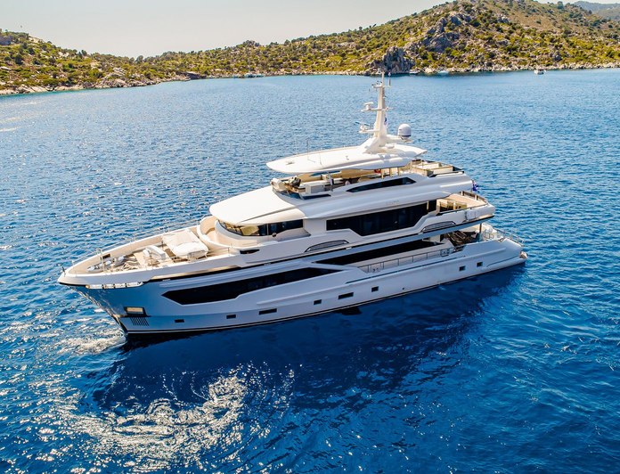 The Kando 110 design from AVA Yachts represents a modern explorer-influenced approach to the 30-metre category: steel construction, full displacement, and a quoted range of 6,500 nautical miles enable itineraries that extend well beyond standard charter circuits. A cruise speed of 10 knots and maximum of 14 knots are consistent with the passage-making priorities of the design. Onboard amenities include air conditioning, an exterior bar, jacuzzi, Portuguese bridge, sunpads, crane, and Wi-Fi — a purposeful specification that emphasises sea-going capability alongside comfort.