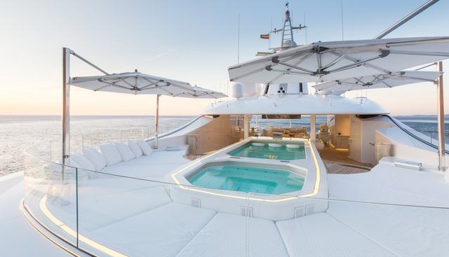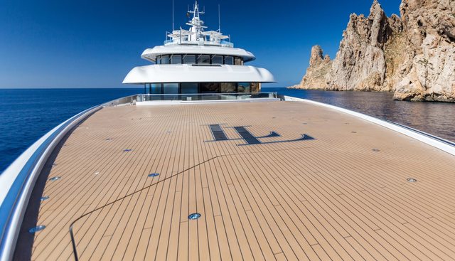 The amenity inventory aboard LADY LARA is extensive: swimming pool, beach club, movie theatre, hammam, sauna, steam room, spa, beauty room, massage room, dance floor, and a helipad confirm her configuration for extended, self-contained voyages. The water sports selection includes Cayago F7 Seabobs, Seadoo 300hp jet-skis, an e-foil, wake and surf equipment, an inflatable water park, and fishing gear, supporting an active programme for the full guest complement. A tender garage and underwater lights complete a yacht charter offer that is thorough in every operational dimension.