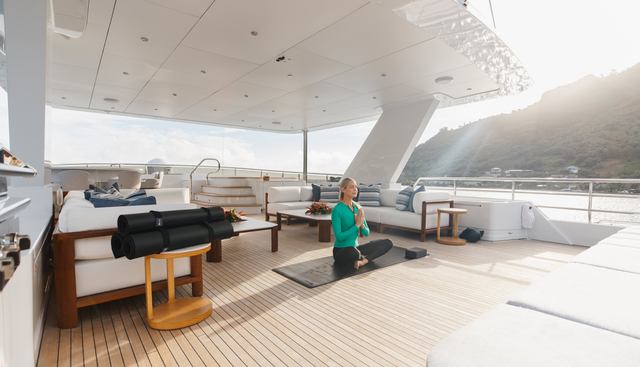 Life aboard Limited Risks is oriented around outdoor living and water access. The sun deck, deck jacuzzi, and exterior bar form the social heart of the yacht above decks, while the water sports inventory is unusually well-developed for a vessel of this character — two Lift Foils, waverunners, a floating pool, full scuba equipment, and a broad selection of surface toys point to owners who take active cruising seriously. Connectivity is handled by Starlink, and the gym ensures longer charter itineraries do not require compromises on routine. The overall tone is active and relaxed in equal measure, rather than formally grand.