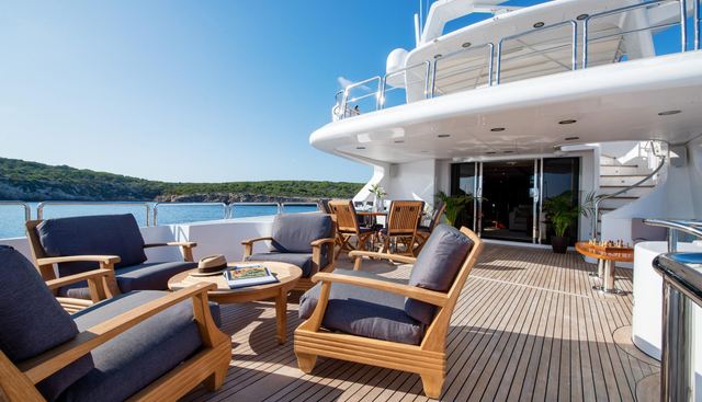 The onboard environment is relaxed and sociable. A deck jacuzzi, sun deck with sunpads, exterior bar, and BBQ form the core of the exterior entertaining spaces. Water toys include Seabobs, inflatable paddleboards, wakeboards, water skis, inflatable trampoline, water park, doughnuts, banana, and full scuba diving equipment with a dive compressor — a well-equipped selection for active guests on a vessel of this size.