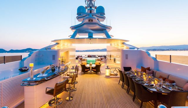 The water sports programme is comprehensive: Yamaha waverunners, an inflatable kayak, Seabobs, wakeboards, fliteboards, paddleboards, waterski equipment, fishing gear, a jellyfish pool, a jungle gym inflatable, and an extended floating platform. This breadth, combined with the 15-person crew, means water sports operations can be run concurrently with other service functions without pressure on the team.