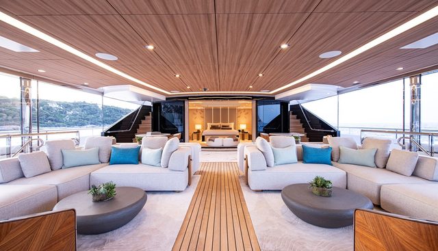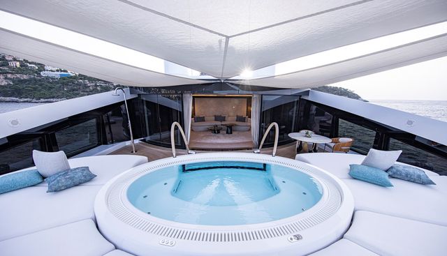 The water sports inventory reflects the same philosophy of completeness: five Seabobs, five Gocycle e-bikes, waverunners and Super Jet jet-skis, a jetsurf, foilboard, sailing dinghy, windsurfer, kite surfer, waterslide, scuba diving equipment, kayaks, paddleboards, an enormous floating pool, and a full complement of towables. The 30-person crew operates every department of this charter yacht at full capacity simultaneously.