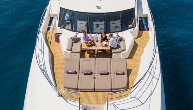 Among Sunseeker builds of her era, MAORO holds her own as a capable open-water performer. Her planing hull delivers a cruise speed of 17 knots with a maximum of 23, while a range of 1,250 nautical miles places her towards the more self-sufficient end of day-charter sportscruisers. Underway stabilizers make that passage speed considerably more comfortable for guests on multi-day itineraries. At 236 gross tons, she carries enough volume to feel spacious without losing the responsive handling that defines the Sunseeker character.