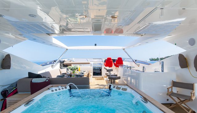 Life aboard MAORO is oriented firmly around outdoor living and water access. The sun deck, foredeck seating, deck jacuzzi, and swimming platform create a layered social environment across multiple levels, while the exterior bar consolidates the outdoor entertaining proposition. Her water toy inventory is unusually comprehensive for her size — two Yamaha GP 1800 jet-skis, a pair of Seabobs, a Zapata flyboard, wakeboards, wakesurf, water skis, paddleboards, and fishing and snorkelling equipment constitute a programme capable of filling days without ever pulling into a marina. Crew of five are positioned to manage both the yacht charter operation and a full water sports day simultaneously.