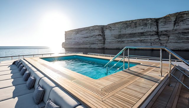 At 107 metres, MAR delivers a sense of scale that few charter yachts can match. Her displacement hull provides genuine sea-keeping quality across open-water passages, and the Benetti custom build standard ensures that structural and engineering decisions were made without the constraints of a production platform. For guests, this translates to quieter passages, greater stability at anchor — aided by at-anchor stabilizers — and a spatial generosity across all interior and exterior areas that feels considered rather than engineered for marketing.