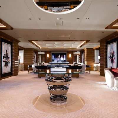 The onboard experience is centred on wellness and active recreation in equal measure. A full spa complex includes a hammam, sauna, massage room, and beauty room, alongside a gym and an owner's study for those requiring a degree of separation from communal spaces. The beach club and swimming platform provide direct water access, complemented by an extensive toy inventory including jet-skis, eFoils, Seabobs, wake boards, kayaks, a windsurfer, and scuba diving equipment. A swimming pool and sun deck complete the exterior offering. The tender garage houses two tenders for shore excursions.