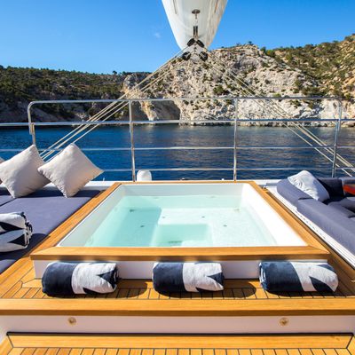 The deck jacuzzi and swimming platform define the onboard leisure character of MASHUA BLUU, supported by kayaks, wake board, water-ski, scuba diving equipment, snorkelling equipment for up to ten persons, and fishing gear — an appropriate inventory for her guest and crew numbers. No tenders are recorded. For groups seeking a simple, well-contained yacht charter in Ibiza or the Balearics with access to watersports and diving, she addresses that requirement without excess.