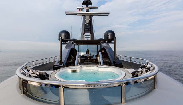 The amenity specification reads as that of a significantly larger vessel: an onboard swimming pool, deck jacuzzi, elevator, helipad, beauty room, gym, satellite communications, and both at-anchor and underway stabilisers. The swimming pool, in particular, distinguishes OKTO from the majority of yachts in the 60-70 metre segment. The Alberto Pinto interior contributes considered spatial design and material quality throughout the guest areas.