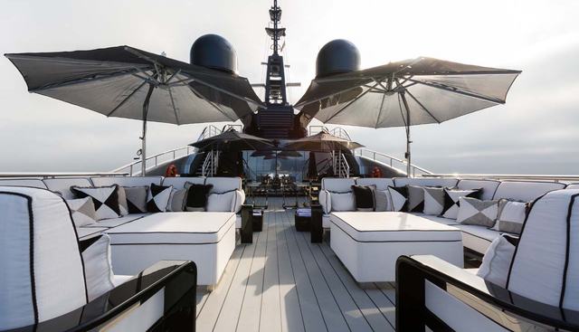 The water sports and dive inventory is one of the most complete in her class: two jet skis, two Seabobs, e-foil electric surfboards, wakeboarding, wakeskating, wake surfing, inflatable paddleboards, a banana, doughnut, inflatable trampoline, Aquaglide inflatable water features, a dive compressor, full scuba equipment, and snorkelling gear. The yacht charter experience aboard OKTO is defined by the contrast between this active water-level programme and the formal, professionally crewed interior — a genuine combination of expedition capability and private-estate service levels.
