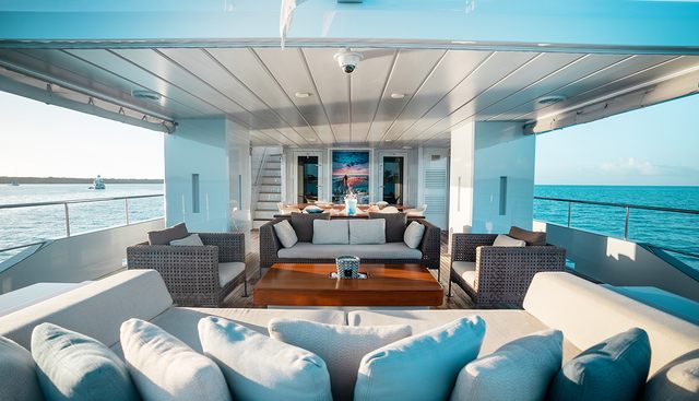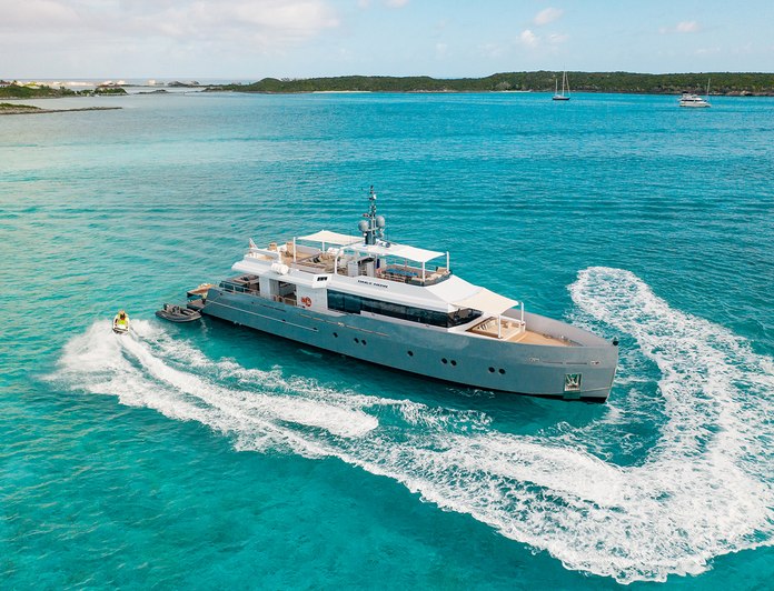 On deck, ONLY NOW offers a deck jacuzzi, foredeck seating areas, sunpads, and a swimming platform providing easy water access. A gym is fitted below, and water toys include two Seabobs, a jet ski, wakeboards, water skis, paddleboards, towables, and snorkelling equipment. Air conditioning and Wi-Fi are fitted throughout. The crew of six manage both the running of the yacht and the full range of guest activities with a standard of service consistent with her premium positioning.