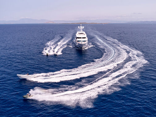 The overall character of ORA is oriented around outdoor living and active water access. A sun deck, exterior bar, and two deck jacuzzis establish the social geography above, while a waterslide and inflatable water park signal a yacht that takes its water programme seriously. Three tenders — spanning 7 metres down to 4.15 metres — provide genuine flexibility for shore excursions, water sports logistics, and independent exploration. For those who prefer a quieter pace, Seabobs and paddleboards offer low-effort time in the water; for those who want speed, two Jet Skis, a Radinn X Sport Jetsurf, and a full suite of tow sports equipment cover the more active end of the spectrum. The movie theatre and gym ensure the onboard experience holds up equally well on passage days or during quieter evenings at anchor.