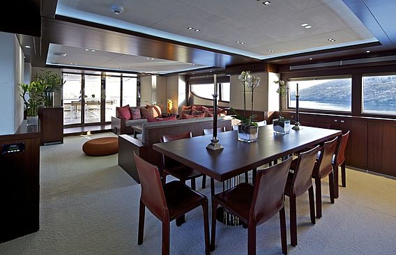 The onboard experience is oriented firmly around outdoor and water-based activity. Her toy inventory is notably comprehensive for a yacht of this size — a Sea-Doo jet ski, kayaks, paddleboards, a banana boat, wakeboard, knee boards, and snorkelling gear among them — which makes her a strong fit for guests who intend to spend as much time in the water as on it. Fishing equipment extends the activity range further. The tender at 4.25 metres is appropriately sized for shore transfers and day excursions across Greek anchorages. Below decks, air conditioning, satellite TV, Wi-Fi, and iPod connectivity keep the onboard environment comfortable during quieter hours. Crew service at a six-to-twelve ratio allows for structured meal service, concierge-level passage planning, and consistent attention to guest needs throughout.