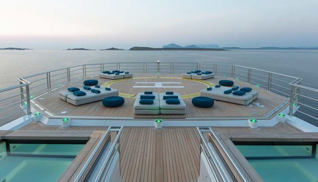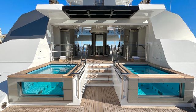 She carries the appointments expected of a vessel of her class: a full spa complex with hammam and sauna, a dedicated gym, a beach club with tender garage, a swimming pool, a deck jacuzzi, and an elevator connecting decks. The practical infrastructure includes a crane, underwater lights, and at-anchor stabilisers — the last of which is rarely superfluous on a vessel this size. Her water sports programme is correspondingly broad, encompassing waverunners, Seabobs, a flyboard, paddleboards, kayaks, waterslide, floating pool, and electric bikes for going ashore.