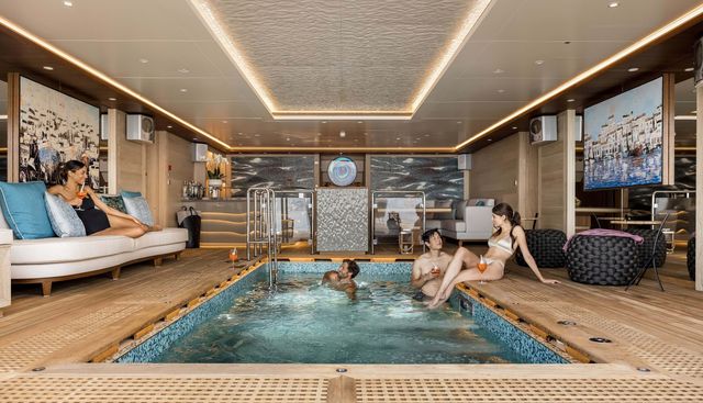 The water sports inventory is substantial: three stand-up Seadoo jet-skis, four Seabob F5s units, electric Fliteboard foilboards, inflatable kayaks, paddleboards, water-skis, wakeboards, and a floating pool provide a wide range of activities for guests of varying interests and ages. Fishing gear, snorkelling equipment, and a drone round out the complement. This is a vessel suited to large family groups, multigenerational charters, and guests who expect an onboard environment that functions as a self-contained destination. Those seeking an intimate or minimalist experience will find her scale and appointment level a mismatch for that preference.