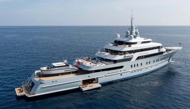 VICTORIOUS is an 85-metre custom displacement superyacht built by Turkish yard Akyacht in 2021, carrying the Cayman Islands flag and designed through a collaboration between naval architect Michael Leach and interior studio H2 Yacht Design. At 85 metres she sits firmly in the upper tier of charter superyachts currently available, offering 12 guests across six cabins and supported by a professional crew of 24. Her steel hull and displacement form are matched to a range of 10,200 nautical miles, giving her genuine ocean-crossing capability rather than merely coastal reach.